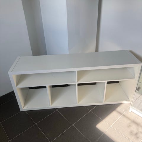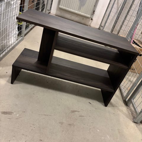 Den har ett hyllplan, små skönhetsskavanker, gjord i trä och plasthjul undertill.