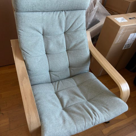 Selling this Ikea Poäng amr chair in wood with red coverage. Used conditions. The cover has been bruised during transportation. Covers can be changed though or a decorative blanket can be put over. Super comfy swinging chair. Original buying price was 1000 skr. Please make an offer. Only self pick up.