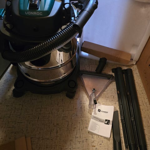 Nilfisk VP300 HEPA EU dammsugare i kartong med bärhandtag på sidan. Enkel modell med hjul och rund behållare enligt bilden på lådan.