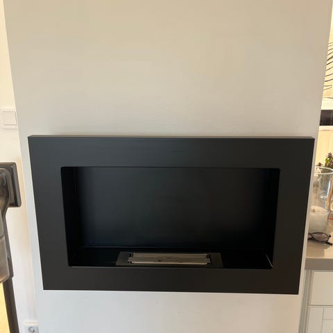 Väggmonterad etanolkamin i vitt med svart insida. Monteras på väggen och har brännare för bioetanol med rak öppning framtill.