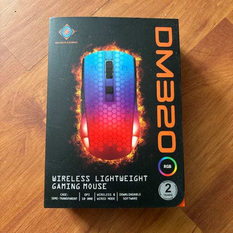 SR7 gamingmus med hålat skal och RGB-belysning. Har kabel, scrollhjul och flera knappar uppe på musen.