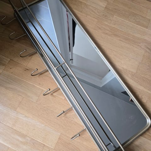 Vägghylla i svart metall med krokar (orange är tejp med tillhörande krokar)