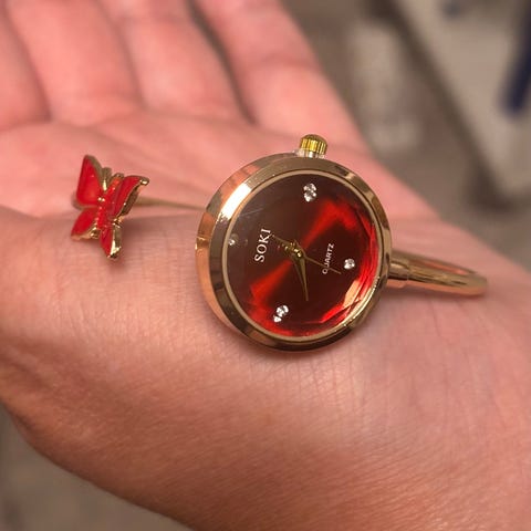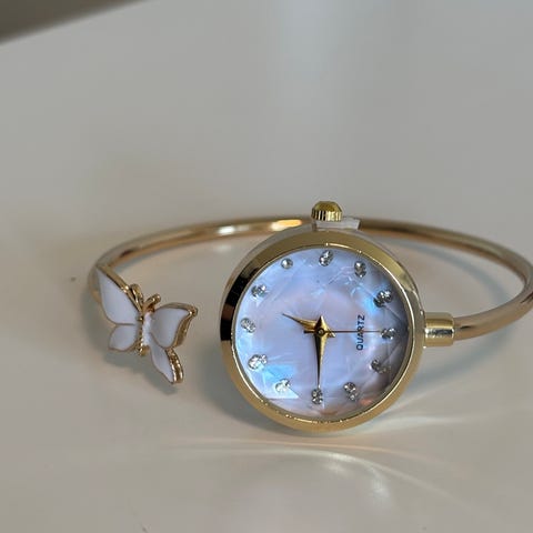Rosa pärldetalj längst ut på det tunna guldfärgade bandet, matchande rosa urtavla med små glimrande stenar. Diamantslipat mineralglas gör att klockan ser läcker ut från alla vinklar 💎