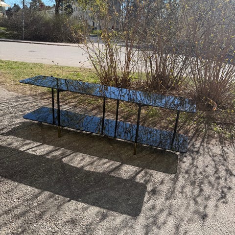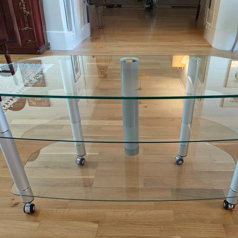Norstone sterobänk eller TV-bänk i transparent glas. OBS dammig på bilderna, bara att torka av. Kan ta nya bilder.