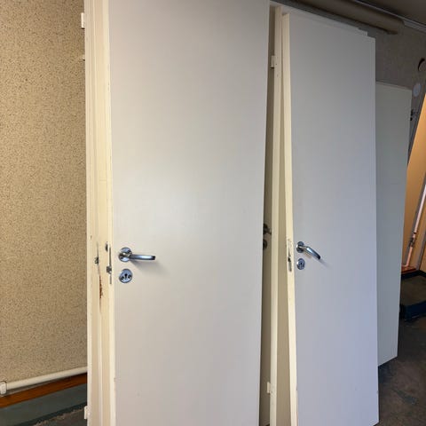 Vit brandklassad dörr B30 med karm och metallhandtag. Karm och tröskel finns till.