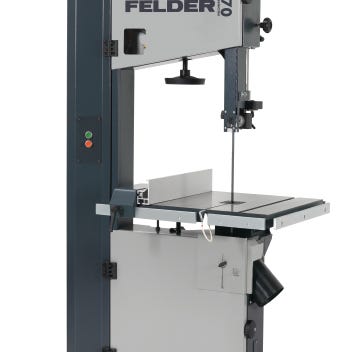 Servus bandsåg med stor gjutjärnsbordsskiva och justerbara rattar för inställning. Utrustad med styrningar runt bladet och separat manöverbox på bordet.