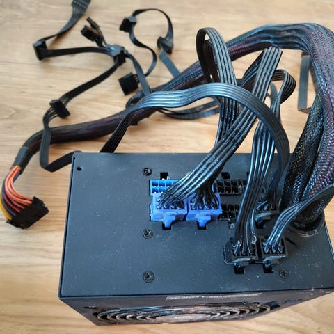 be quiet! Kraft 600W nätaggregat till stationär dator. Flera fasta kablar med olika kontakter, fläkt på ovansidan och svart hölje.
