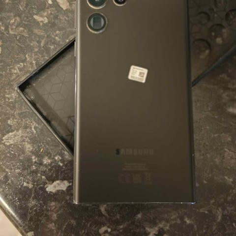 Samsung Galaxy S24 Ultra med 256 GB lagring, stor skärm och flera kameror på baksidan 200 mp. Har pekskärm med Always On-display och visas här tillsammans med originalkartong och ett fodral.