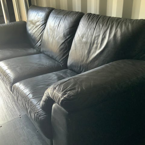 Blå lädersoffa i 3-sits tillsammans med en matchande 2-sits. Mjuka rygg- och armstöd som ger skönt stöd när man sitter.