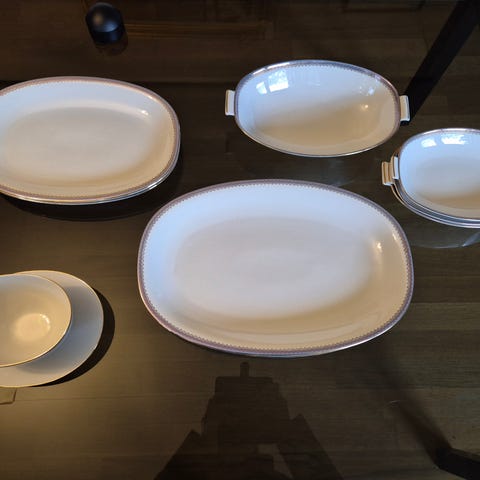 Porslinservis från Rörstrand, serien Forma i brun/vitt med tallrikar, uppläggningsfat och skålar. Flera delar har lock och handtag, och det finns både runda och rektangulära formar.
