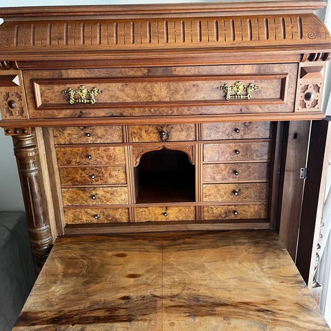 Fin sekretär i ljust trä med klaff och skåpdel nertill. Inuti finns flera små lådor och fack som gör det lätt att hålla ordning på sakerna.