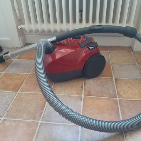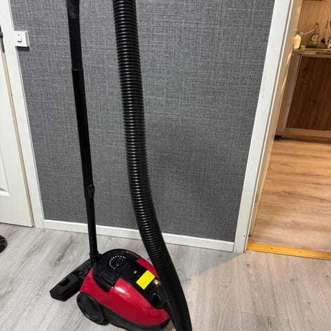 Röd dammsugare från Philips med hjul och bärhandtag upptill. Har teleskoprör, golvmunstycke och lång slang som är lätt att komma åt med.