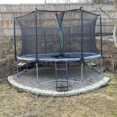 Studsmatta med skyddsnät runt om och stege för att komma upp.
