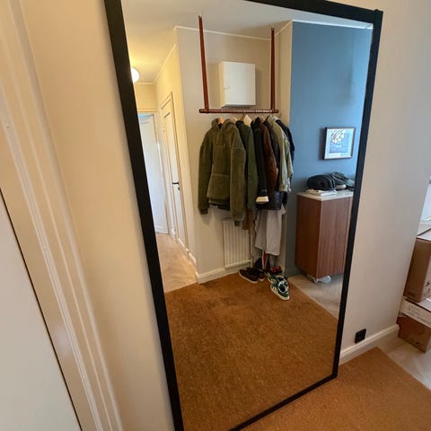 Spegel från IKEA med träram. Passar bra i hall eller sovrum där man vill ha en helkroppsspegel nära garderoben.