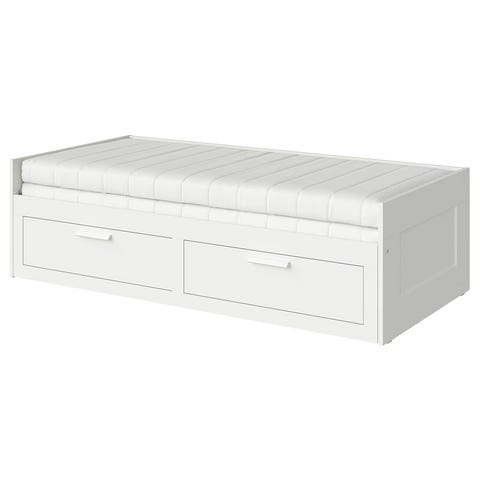Vit säng från IKEA med två stora lådor undertill. 1 Madrass medföljer och sängen är enkel och praktisk att möblera med.