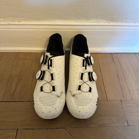 Bontrager Circuit Road cykelskor i stl 47, vita med svart insida. Snabbspänne med ratt och kardborre samt styv sula för landsvägspedaler.