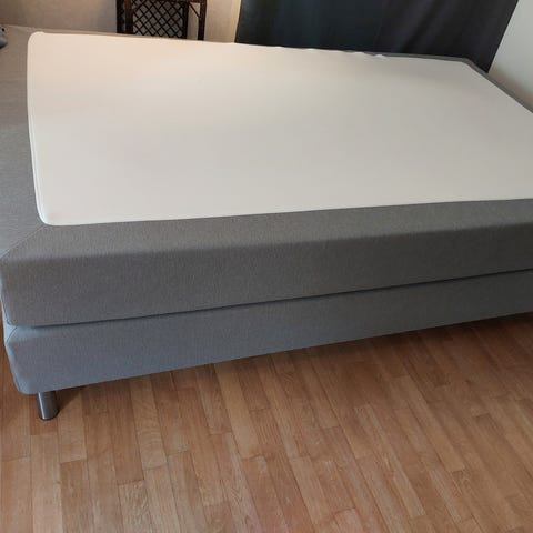 Grå säng från Mio med hög, stoppad gavel och metallben. Madrass och bäddmadrass ingår på bilden, och sängen är 110*200 cm.