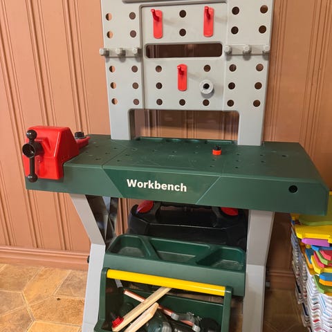 Black & Decker leksaksverktyg i hård plastväska med bärhandtag. Inuti finns bland annat leksaksborrmaskin, skiftnyckel och skruvar i plast.