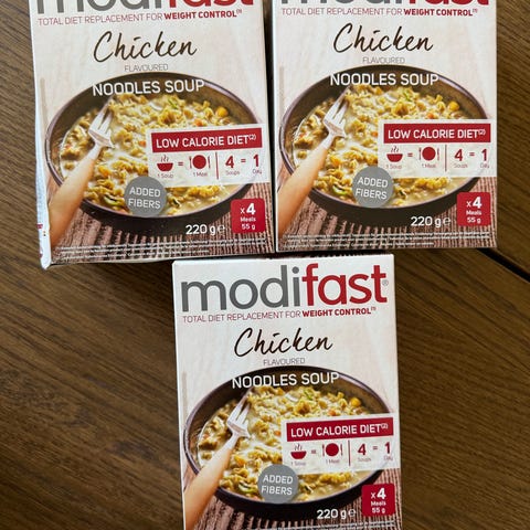 Tre paket Modifast Pasta med svamp som måltidsersättning. Se bild för bäst före-datum.