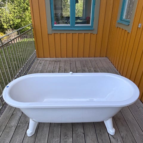Vitt badkar från Gustavsberg, ca 158 cm långt enligt måttbandet på bilden. Fristående modell med avrundade kanter och avlopp i ena änden.