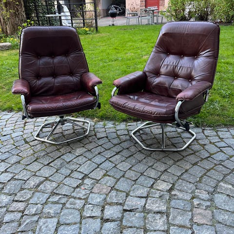 Två fina välvårdade snurrfåtöljer med utfällbar fotstöd.