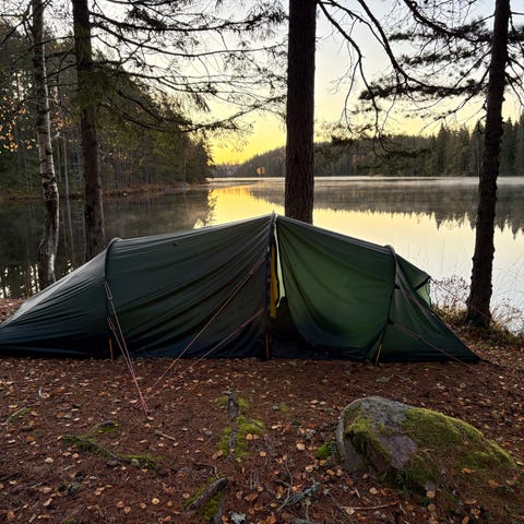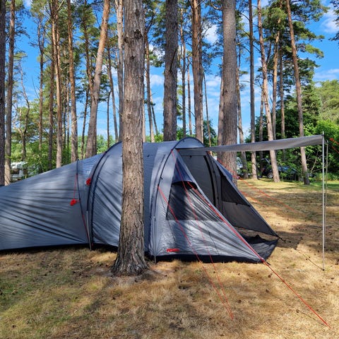 Komplett uppsättning av 8 manna tält/4rum Everest full stå höjd med fönster, samt ett litet kylskåp för mat och dryck. Ingår även ett hopfällbart campingmöbel med hyllor och bordsskiva för förvaring och matlagning på plats.