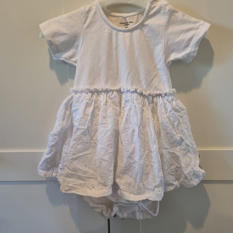 Vit klänning från Girls i stl 104 för flicka. Kortärmad modell med dragkedja bak och dekorband i midjan.