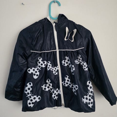 Vit jacka från MioMao i stl 92 för flicka, med dragkedja fram och huva. Har fjärilsdetaljer och resår i midjan samt randigt foder vid halsen.