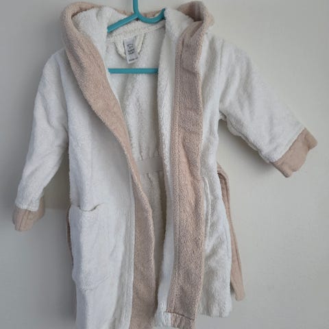 Vit och rosa badrock i stl 110 för flicka med huva och rosa stjärnor. Har knytskärp i midjan och två fickor fram.