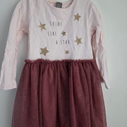 Röd klänning från Little Kids i stl 116 med rutigt mönster och svart midjeband. Knäppning bak med knappar och lite puffig kjol.