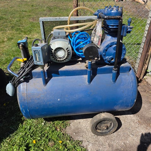 Kompressor i nyskick, med 24liters tank, slang på rulle som fjädrar tillbaka längd 10meter, trycklufts borrmaskin, blås munstycke, munstycke med mätare för bil/ cykel.