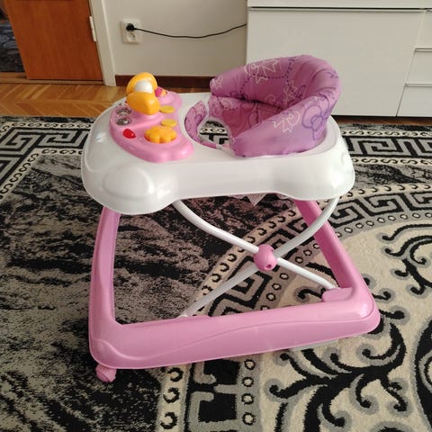 Aarikka gåstol i rosa och vitt med mjuk sits med mönster. Fram finns en liten lekpanel med knappar och snurrande bollar som barnet kan pyssla med.