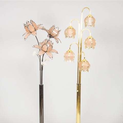 En lekfull formbar lampa med sex ljuskällor placerade i blommor med tunna kronblad i klippt plåt i guldfärg.