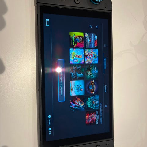 Handhållen spelkonsol med retrospel och röd/blå kontroller på sidorna. Har styrkors, flera knappar och högtalare på baksidan. Säljes för 500 kr tar endast kontanter