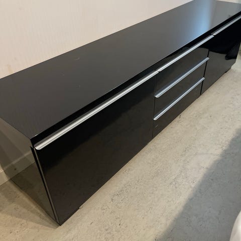 Säljer en mycket snygg och modern TV-bänk i svart höglans (glossy finish). Bänken har en minimalistisk design med rundade hörn och eleganta metallben, vilket ger ett lyxigt intryck i vardagsrummet.