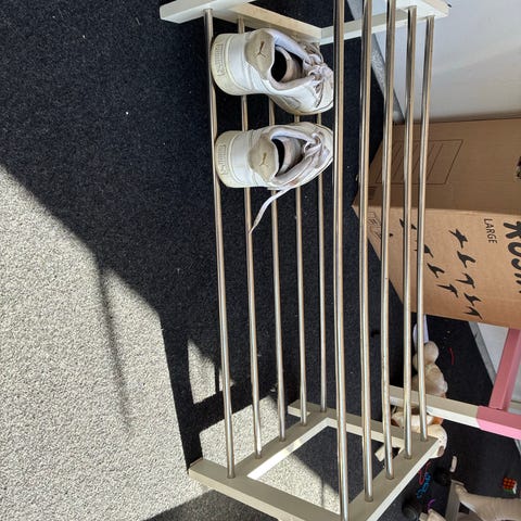 Vitt skoskåp från IKEA med två fack och enkla handtag. Övre delen har ett öppet fack som ger extra förvaring.