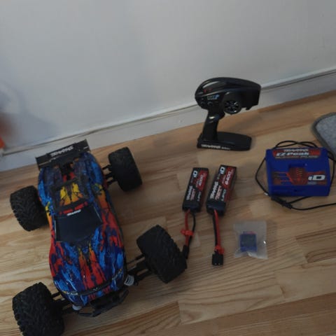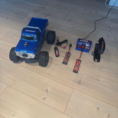 Traxxas Rustler radiostyrd bil i blått med grova däck. Med styrhandtag och laddare, batteri samt batterifack under karossen.