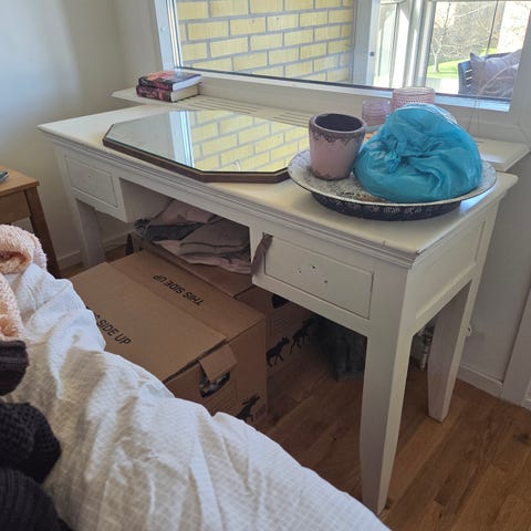 Vitt skrivbord med ben i metall och skåp med låda på sidan. Bra arbetsyta och plats för förvaring i skåpet under. Väl använt med några fläckar men har mycket kvar att ge.