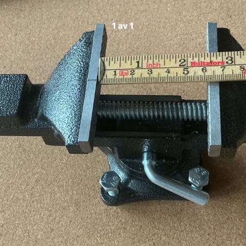 Praktiskt litet skruvstäd som kläms fast i bordsskivan med skruvklämma. Har vridbart huvud och flera justerskruvar med röda handtag.