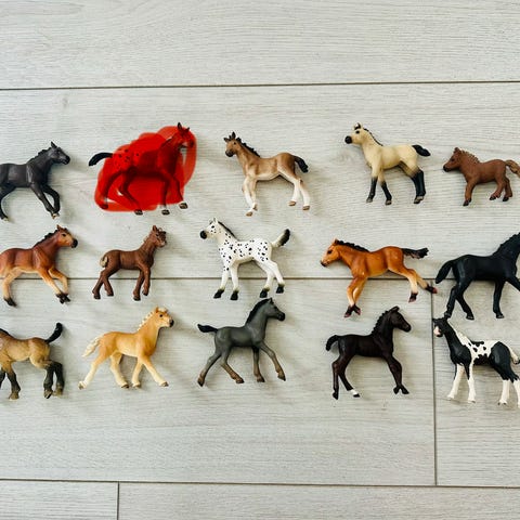 Paket med Schleich-hästar, föl och andra djur samt lite småfigurer. Följer med hage, täcken, grimma och några småprylar som syns på bilderna.