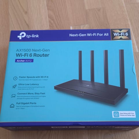 TP-Link Archer A8 AC1900 dual band Wi-Fi-router med tre antenner. Står i originalkartong med info om funktioner och portar på sidorna.