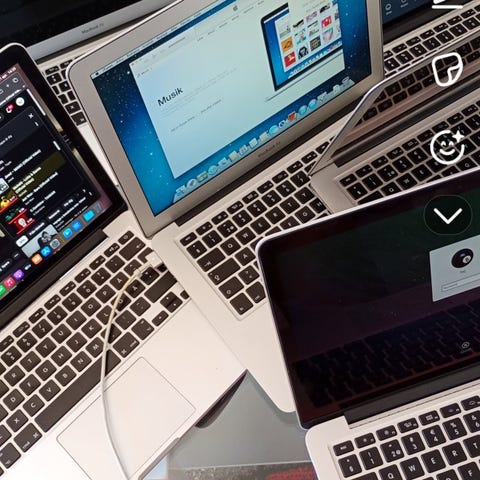 Flera Apple MacBook-laptops säljes tillsammans, alla i silver med bakbelysta tangentbord. Blandade modeller och skärmstorlekar, flera Detta är en Apple MacBook Pro, en högpresterande bärbar dator.