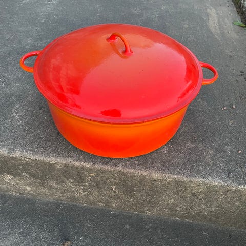 Gjutjärnsgryta med orange utsida och svart insida, mycket fint skick