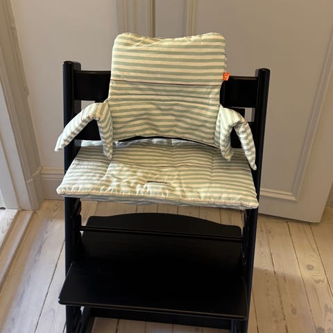 Stokke Tripp Trapp Newborn Set i grått med sele och mjuk stoppad sittdel. Fästs på Tripp Trapp-stolen och har justerbart ryggstöd.
