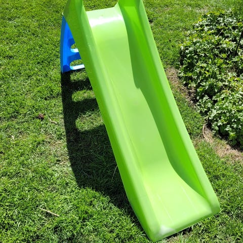 Rejäl rutchbana i röd plåt och rostfri bana. Liknande som finns på allmänna lekplatser tex.