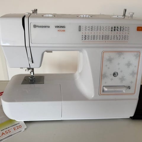 Husqvarna Viking H Class E20 symaskin i vitt med flera olika sömmar och tydlig sömguide på ovansidan. Har fotpedal, enkel ratt för inställningar och praktisk trådrullshållare upptill. Nypris 3495:-
