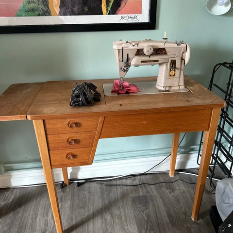 Fint trä syskrin med flera utdragbara fack och rejält handtag. Perfekt för att hålla ordning på sygrejer eller småprylar hemma och en pall.