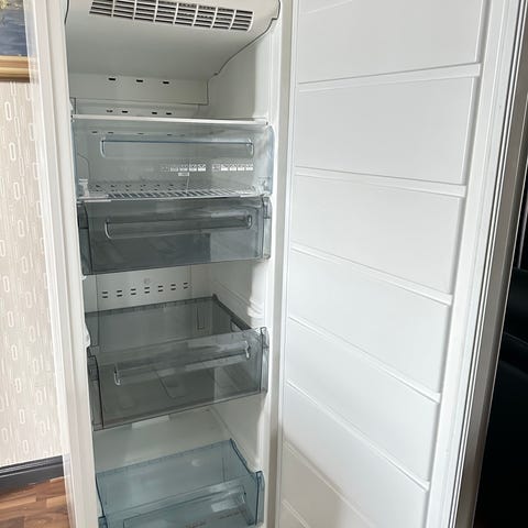 Vit frys från Elektro Helios med flera trådkorgar och hyllor invändigt. Högt skåp med enkel dörr och handtag på sidan. Funkar bra men blir snabbt isig.