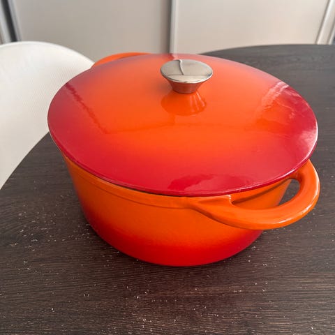 Gjutjärnsgryta från Le Creuset i den ikoniska orange/volcanic-färgen. Perfekt för grytor, soppor, bröd eller långkok – håller värmen fantastiskt bra och fungerar på alla spisar inklusive induktion.