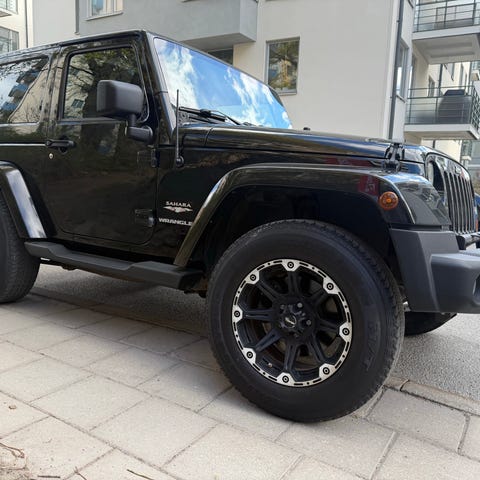 Oanvänt reservhjul med skydd som suttit på en jeep wrangler JK. Centrum kåpa finns oxå.